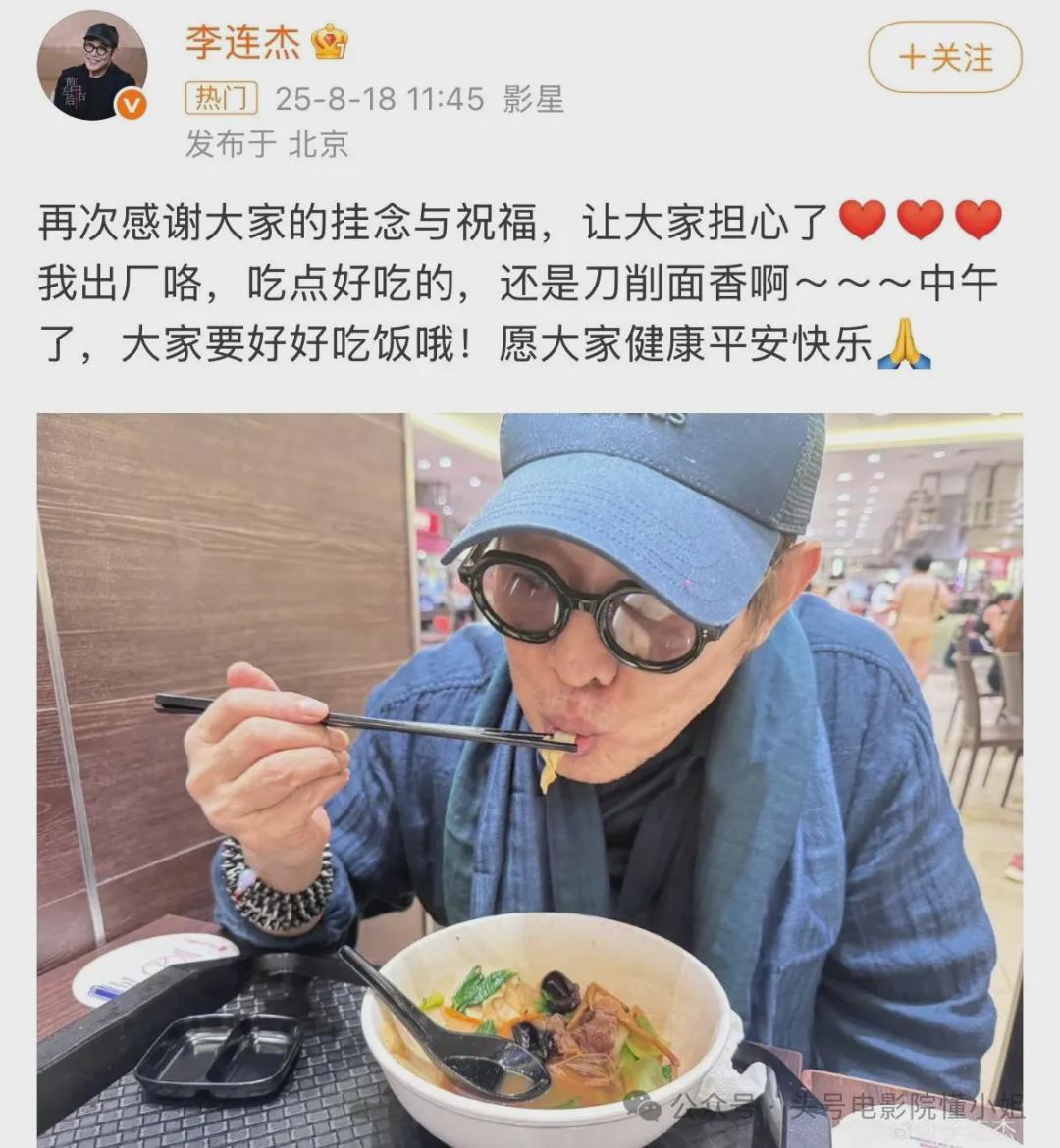 8月18日中午,李连杰再次更新社交账号,晒出自己最新的吃刀削面照片报平安。